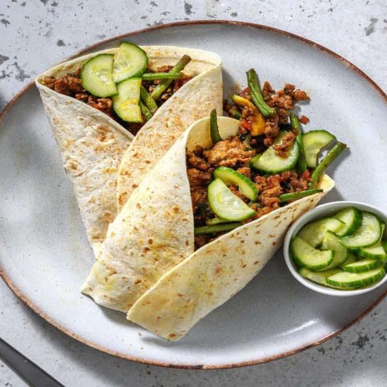 - Kruidige wrap met kipgehakt en sperziebonen met zoetzure komkommer