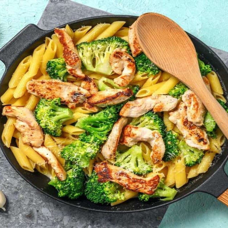 - Eenpanspasta kip Alfredo met broccoli en geraspte kaas