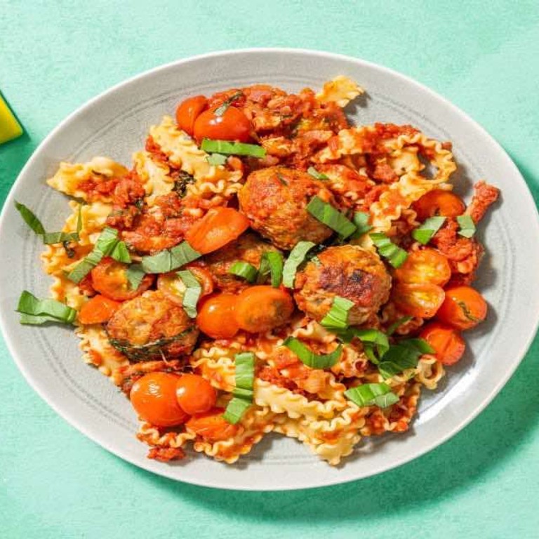 - Pasta al forno met zelfgemaakte gehaktballen met spekjes, tomatensaus en Italiaanse kaas