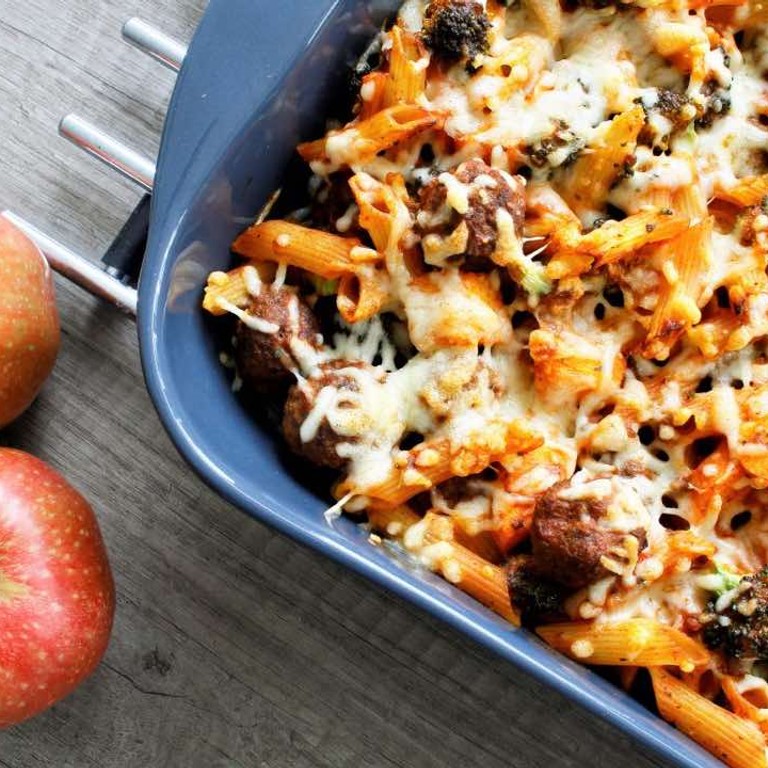 - pastaschotel met pesto-gehaktballetjes en appel. -