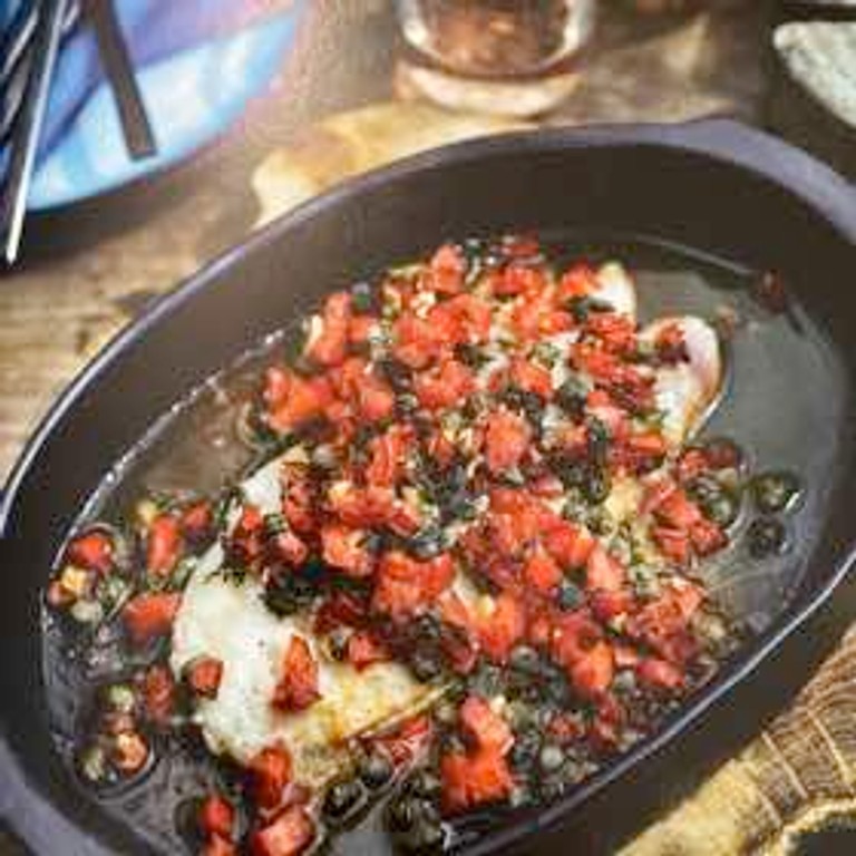 - Poisson rôti aux épinards à la crème, petites tomates et olives