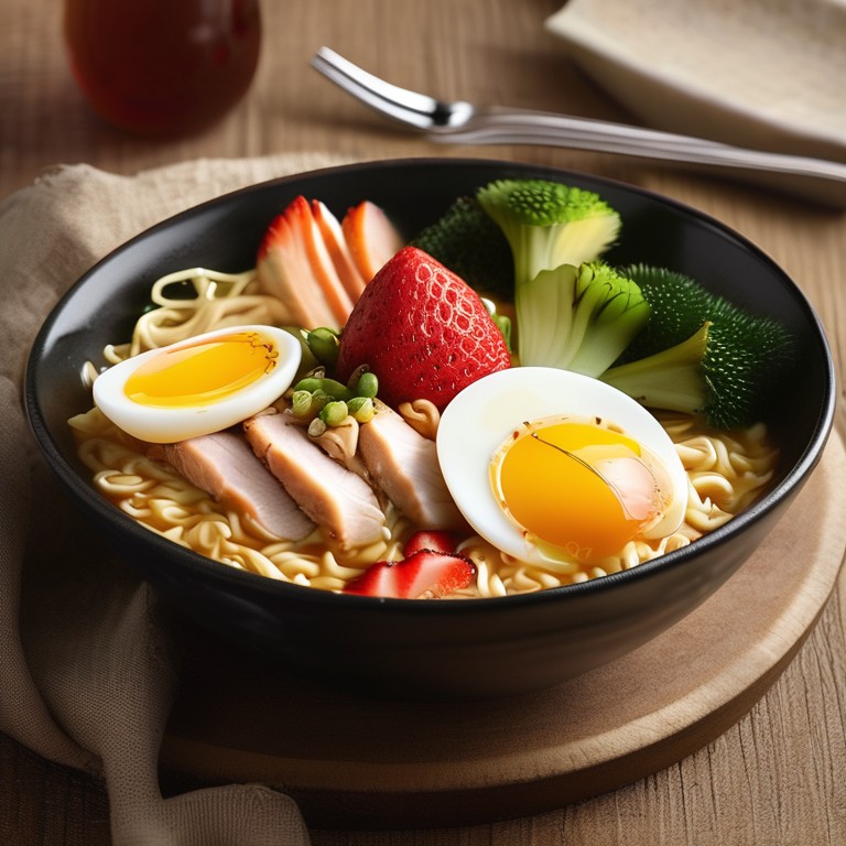 - Cheesy Ramen Noodle Bowl with Strawberry Chicken and Soft-Boiled Egg