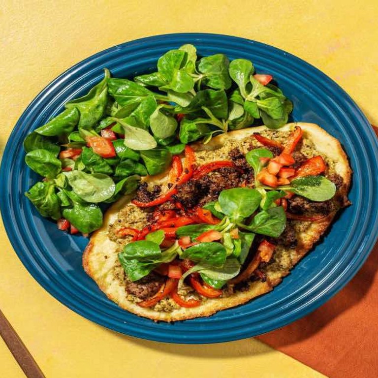 - Naanpizza met pesto-roomkaas en rundergehakt met frisse salade