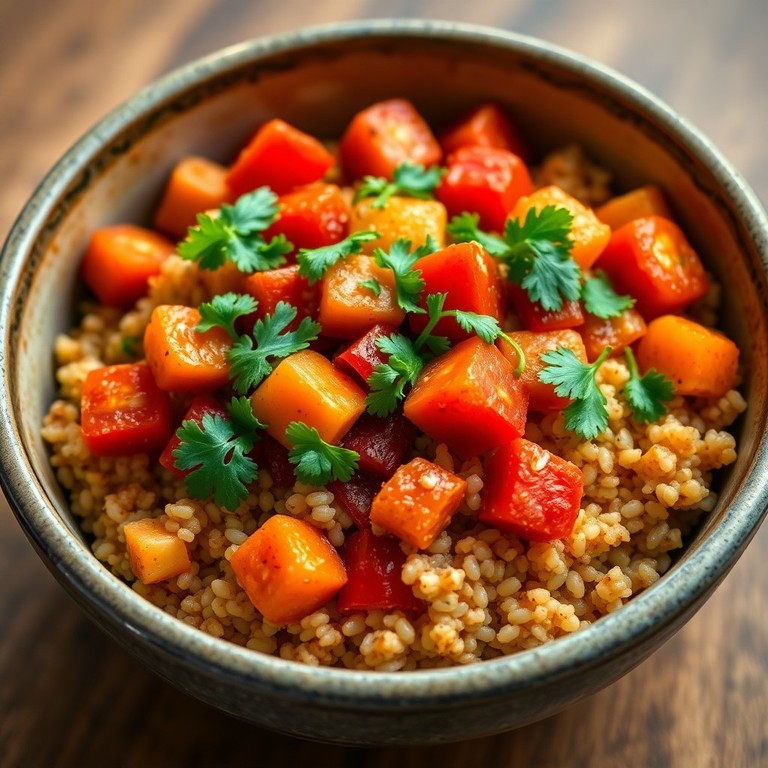 Spiced Tomato and Onion Quinoa Bowl with Roasted Root Vegetables