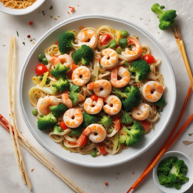 Shrimp and Chicken Rice Noodle Stir Fry with Broccoli and Veggies