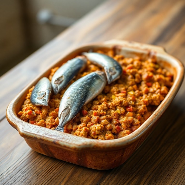 Carne Moída Temperada com Colorau e Sardinha ao Forno