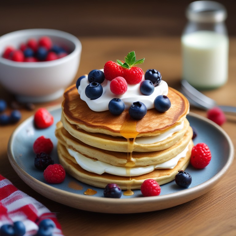 Fluffy Protein Pancake Bowl with Fresh Fruits and Maple Syrup