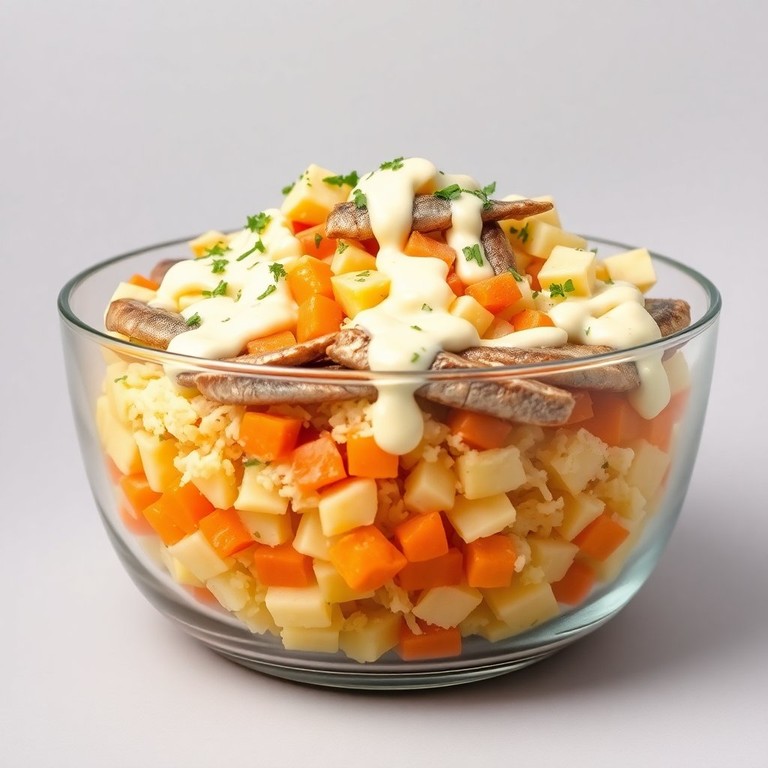 Салат «Сардины под шубой» с нежным слоем картошки и моркови
