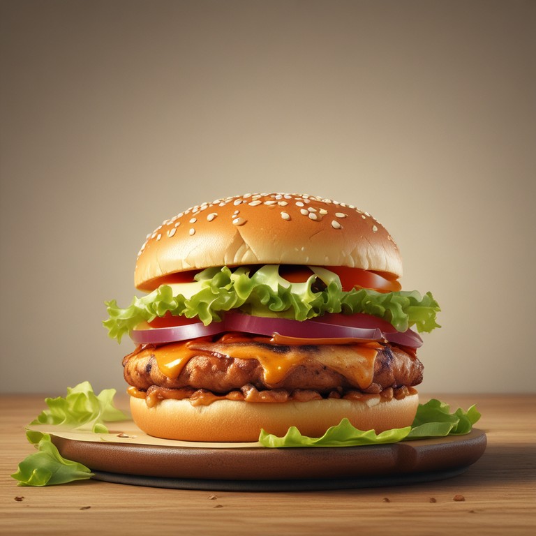 - Burger de Poulet avec Salade de Laitue, Moutarde, Cheddar, Oignons Caramélisés, Relish et Sauce Barbecue