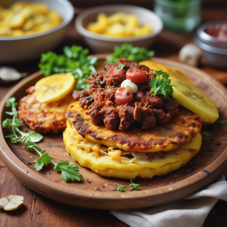 Patacones Abajo Arriba con Carne, Papas Ripiadas y Queso Mozzarella
