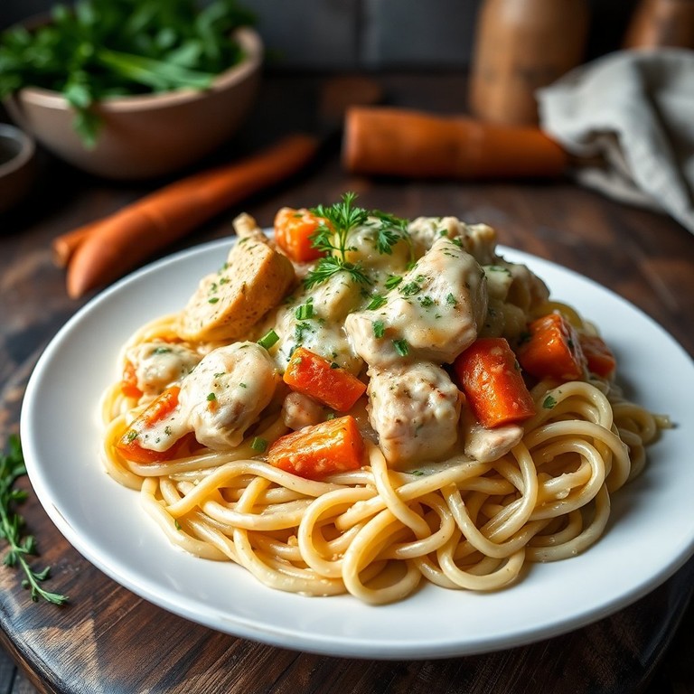 Poulet Crémeux aux Poireaux et Carottes avec Pâtes