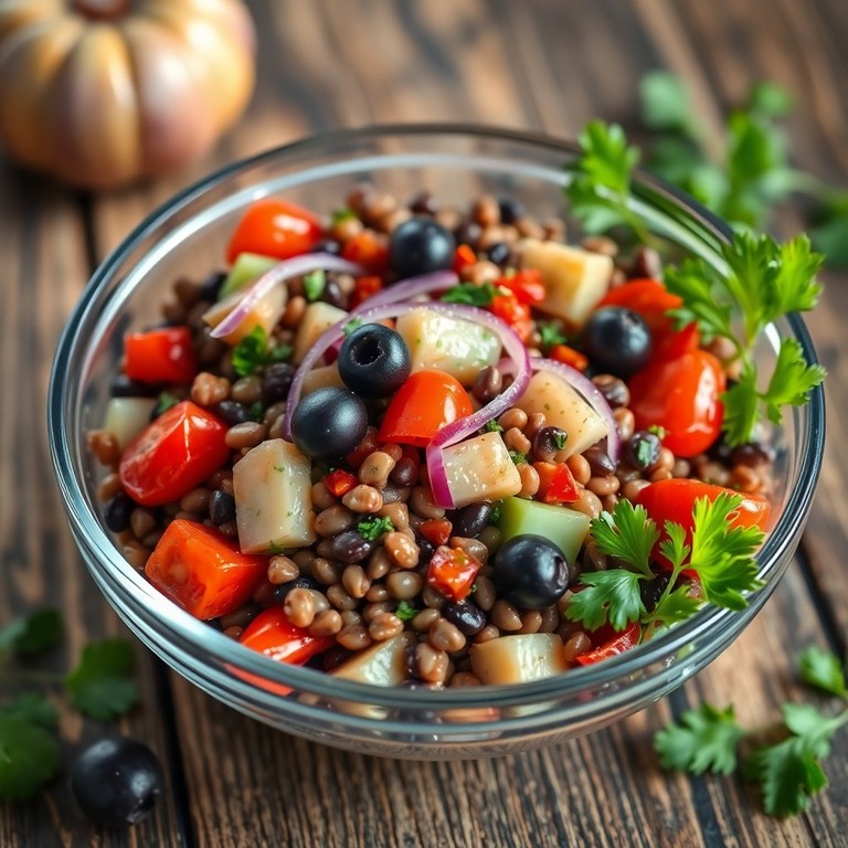 Ensalada fría de lentejas con cebolla, aceitunas negras y pimientos asados