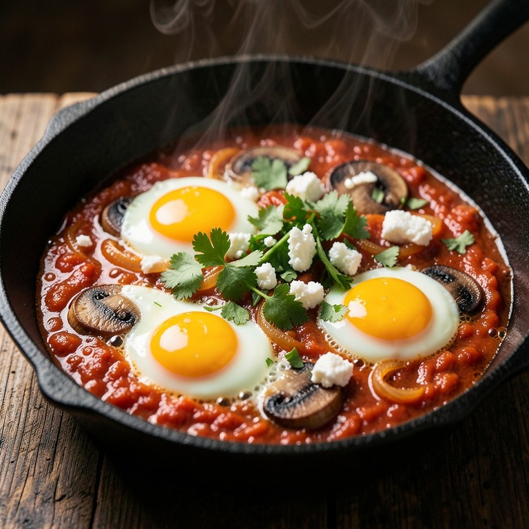 Spicy Shakshuka with Poached Eggs and Sautéed Mushrooms
