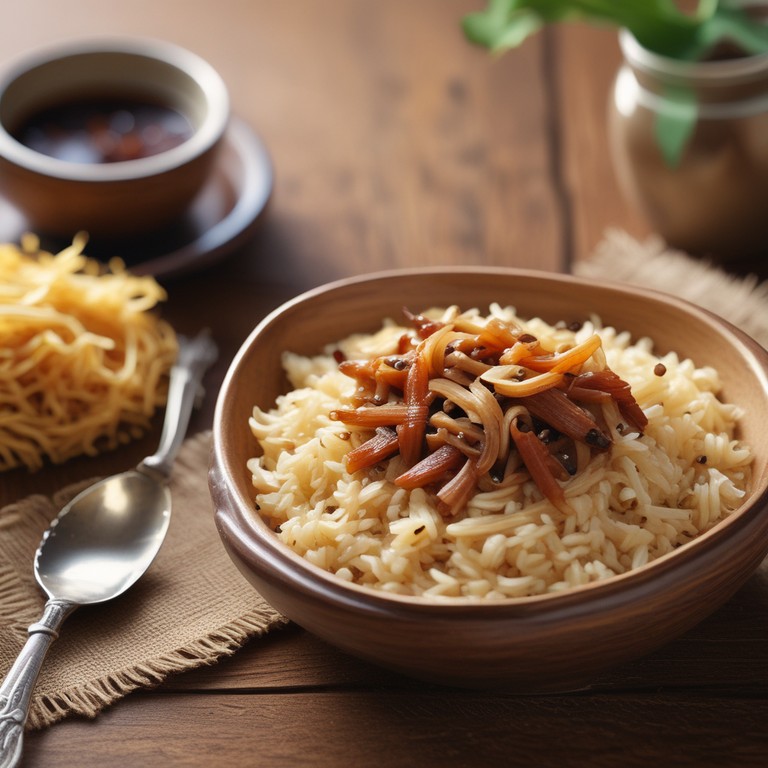 Arroz e Macarrão à Moda do Café com Cebola Caramelizada