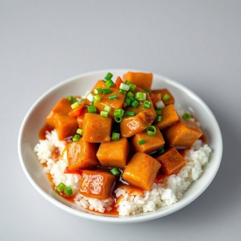 Carne de Puerco en Cubos con Salsa de Miel y Soja sobre Arroz