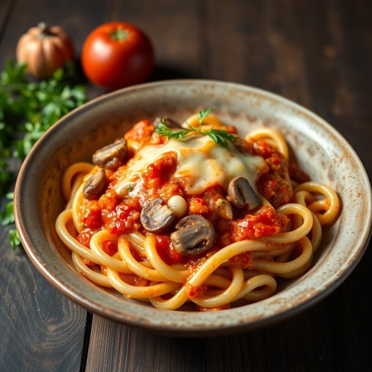 - Käsiges Nudelgericht mit Zwiebeln, Champignons und Tomaten-Sahne