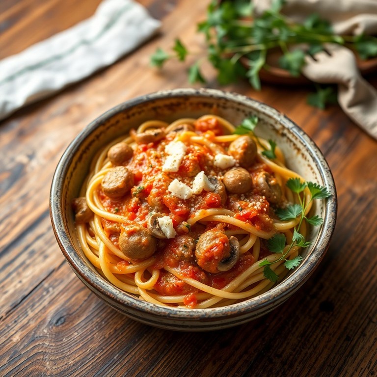 - Käsiges Nudelgericht mit Zwiebeln, Champignons und Tomatensahne