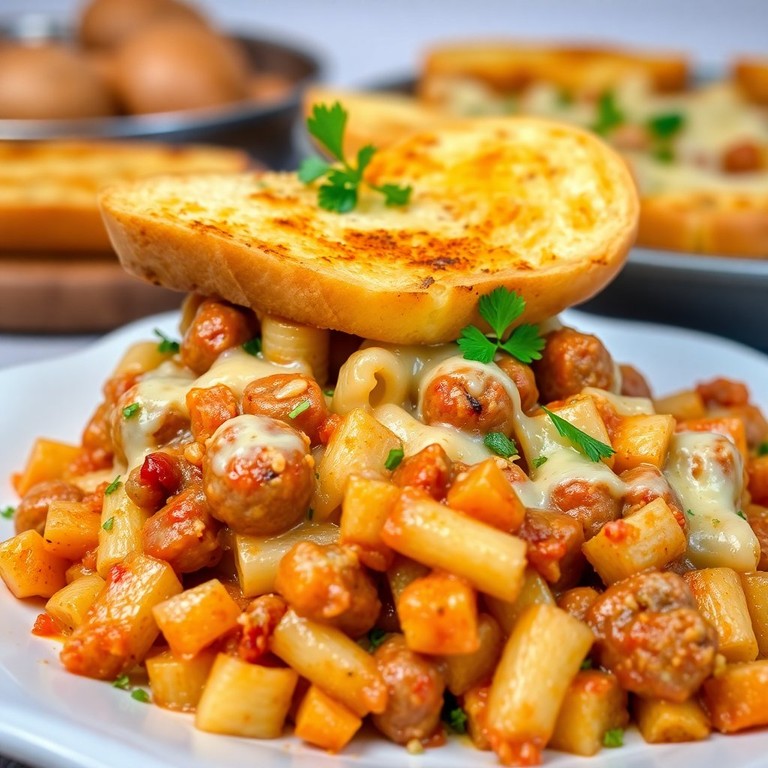 Garlic Bread and Potato-Stuffed Sausage Pasta Casserole