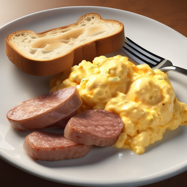 Scrambled Eggs with Toast, Sausage, and Ground Meat