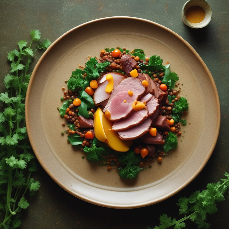 - Geräucherte Entenbrust auf einem Bett aus Linsen und Mango