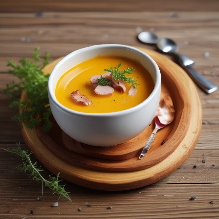 - Karotten-Kokos Suppe mit Geräucherter Entenbrust und Thymian Croutons