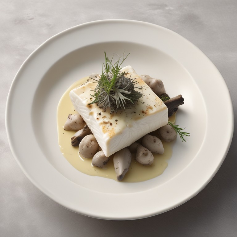 - Gedämpfter Heilbutt auf Spitzmorcheln mit Trüffelrahm, Rosmarin und Schnittlauchröllchen