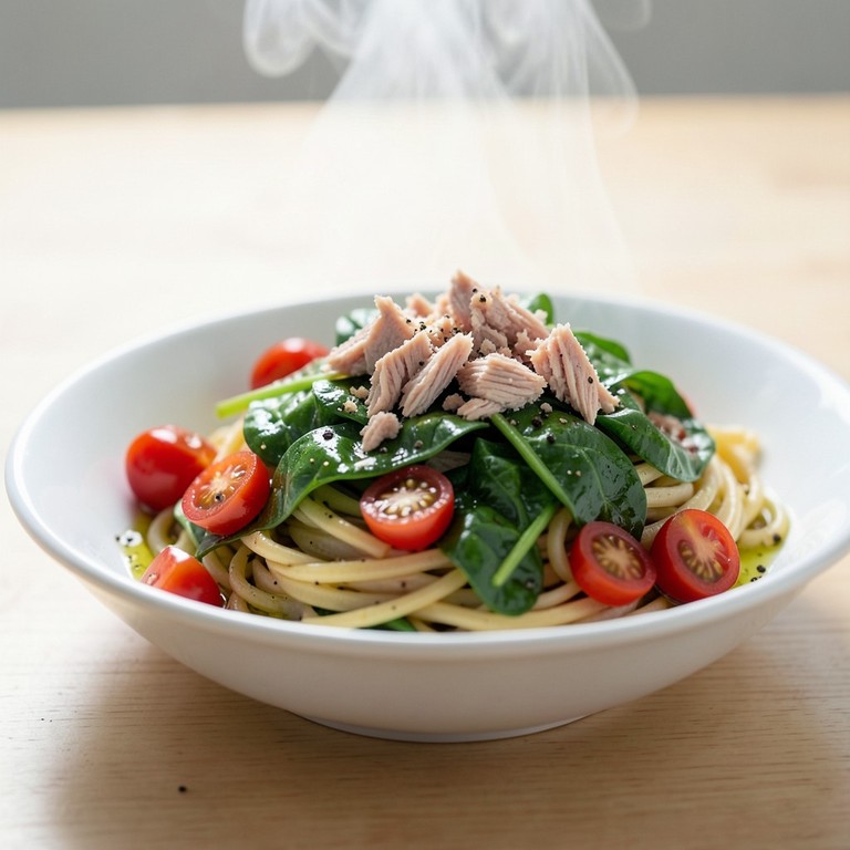 Massa Integral com Atum, Tomate Cereja e Espinafres Salteados