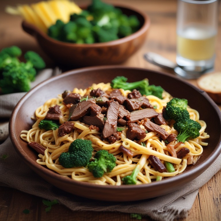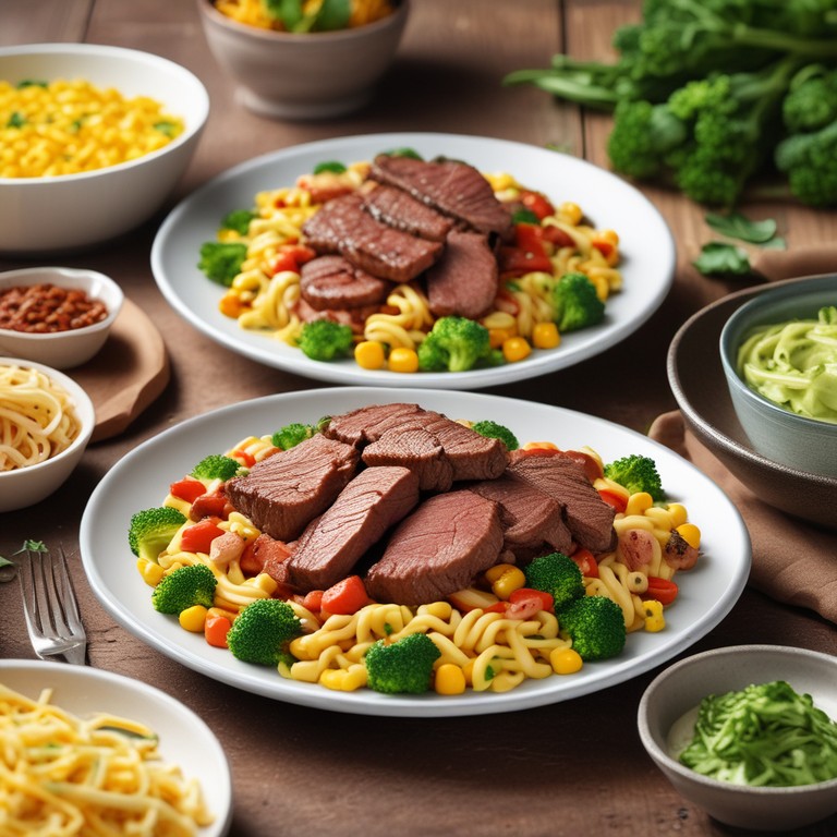 Patinho em Iscas com Brócolis, Macarrão e Batata com Milho Verde