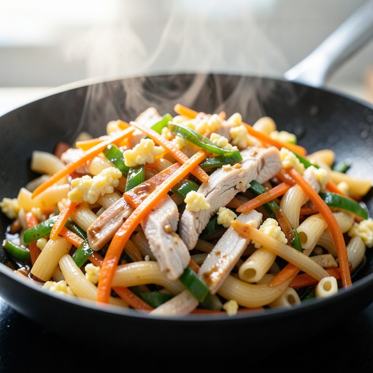 Fideos Codito Salteados Rápidos con Pollo y Huevo