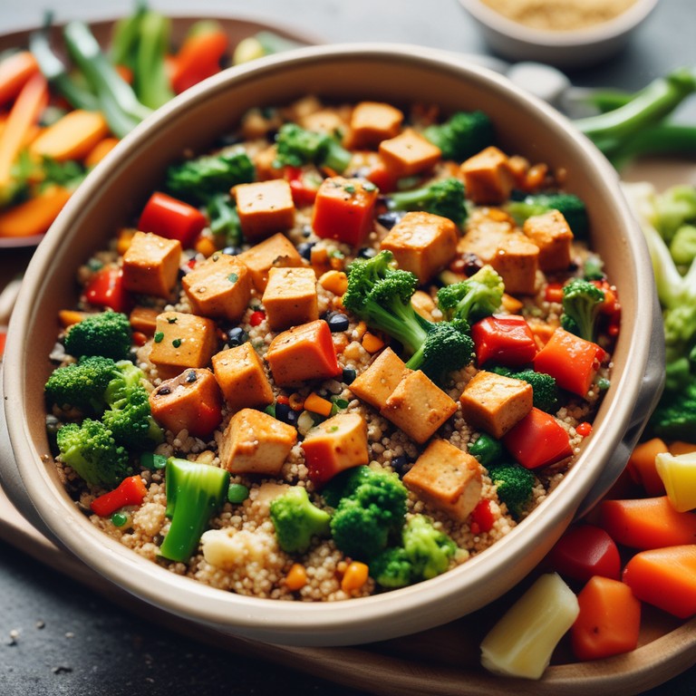 Crispy Tofu and Veggie Bake with Quinoa and Savory Sauce