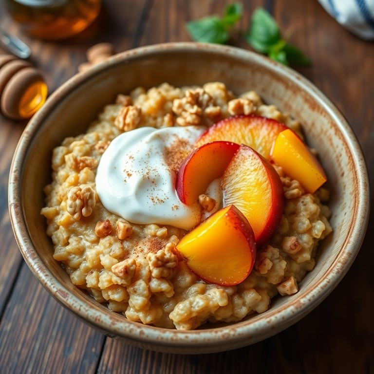 Baked Banana Nut Oatmeal with Yogurt and Peaches