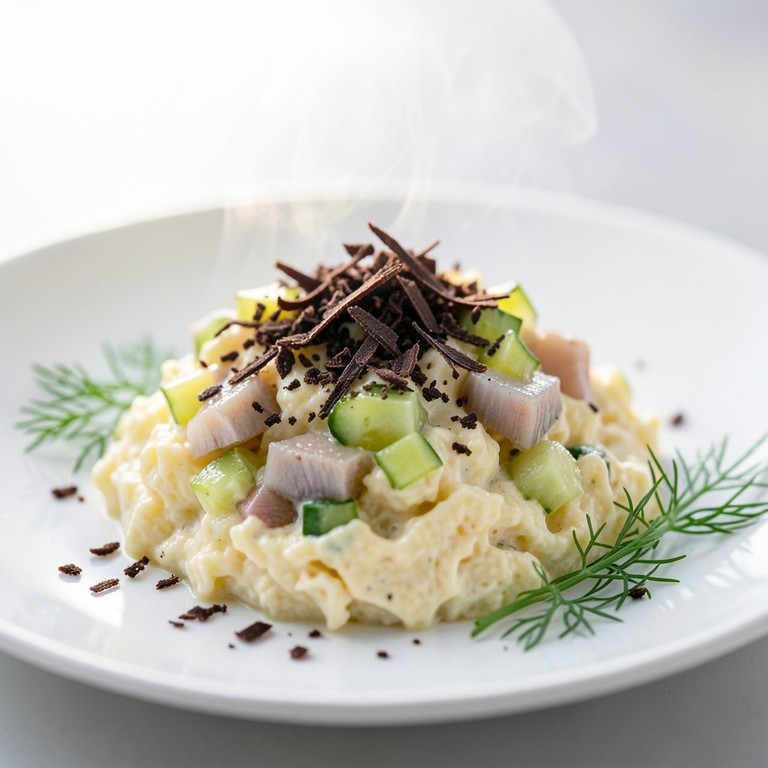 Яичница с шоколадной крошкой, рубленой сельдью и маринованным огурцом