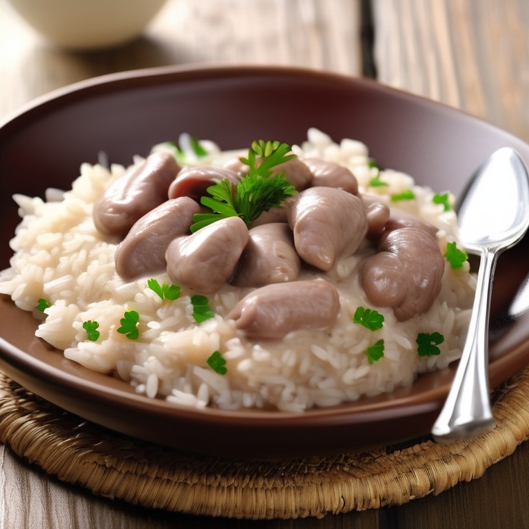 A hearty and creamy dish featuring tender chicken hearts and flavorful rice mixed with a savory sour cream sauce.
