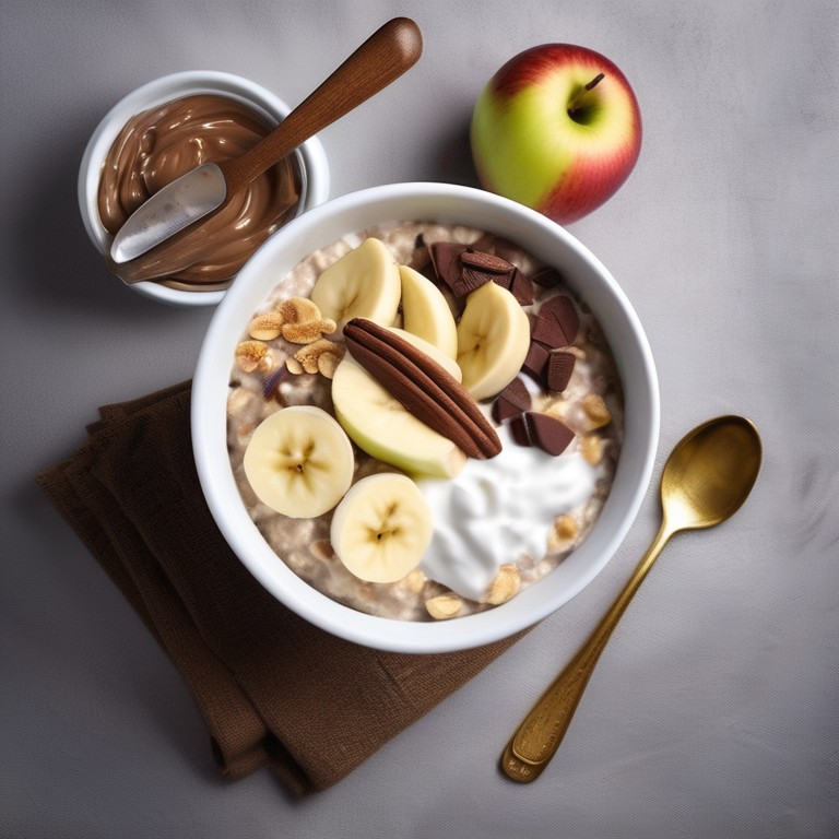 A delightful and nutritious breakfast bowl featuring creamy oatmeal with ripe bananas and sweet apples, topped with creamy yogurt, a drizzle of coconut oil, a sprinkle of cacao, and a dollop of creamy peanut butter.