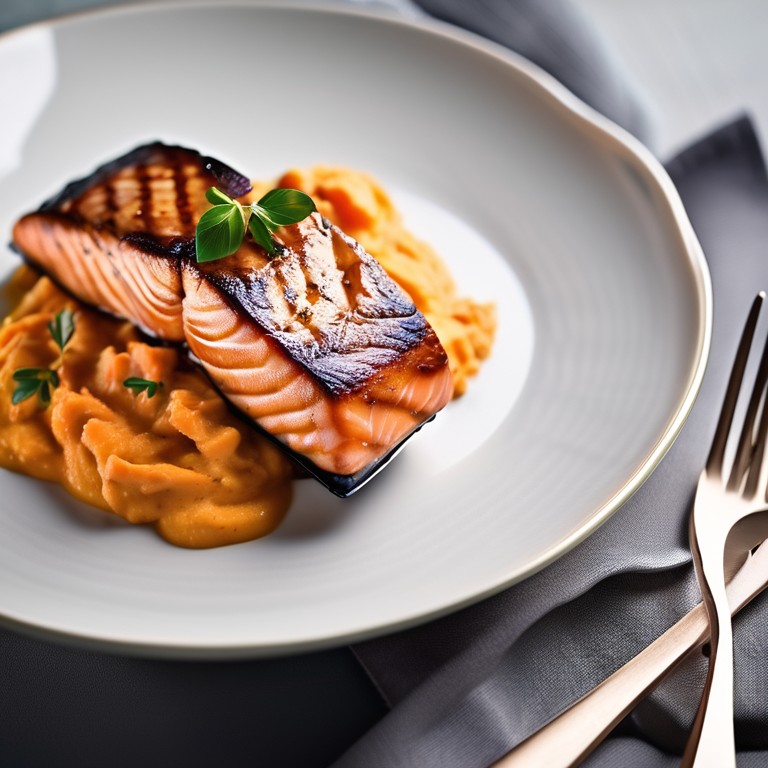 Un plat délicieux et sain de saumon grillé accompagné d'une purée onctueuse de patates douces.