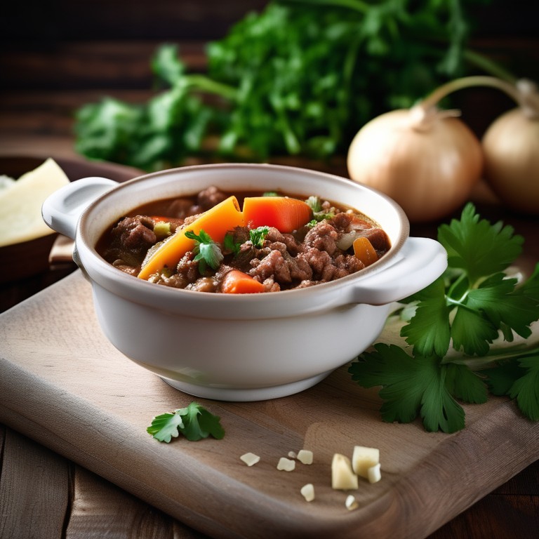 Un ragoût réconfortant et nourrissant, mettant en vedette du boeuf haché, des tomates, des navets, et des carottes. Parfait pour un dîner familial chaleureux.
