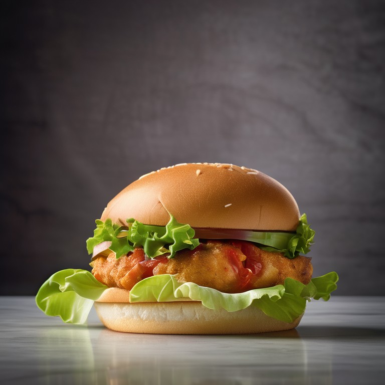 Um delicioso hambúrguer de frango com pão francês, tomate fresco e um molho de tomate caseiro.