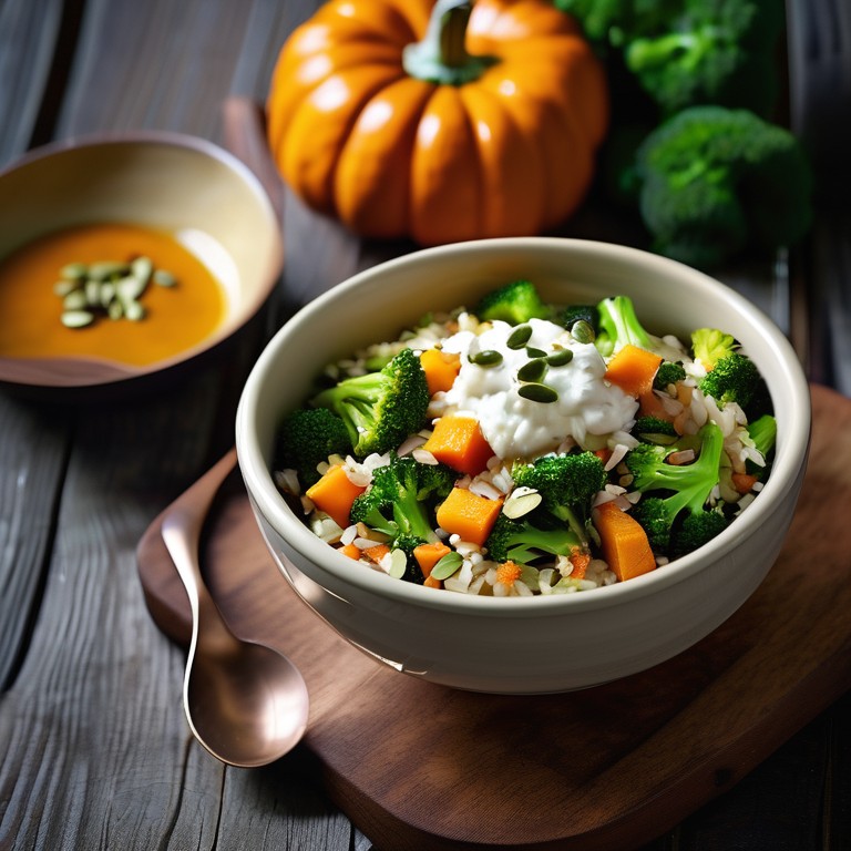 This wholesome and vibrant rice bowl is a perfect autumn feast, combining the sweet, roasted flavors of pumpkin with the earthiness of broccoli. Topped with creamy cottage cheese, it's a delightful mix of textures and flavors that's sure to please. A nourishing and quick meal ideal for lunch or dinner, this bowl is not only packed with nutrients but also gives you a satisfying gastronomic experience.