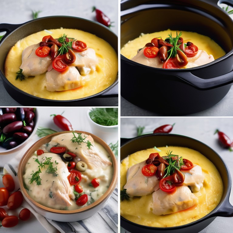 A mouthwatering dish combining tender chicken breast fillets, creamy cottage cheese, flavorful polenta, sweet bell peppers, onions, and optional Icelandic skyr for a luxurious twist. Additional ingredients are added to enhance the flavors of this hearty meal.