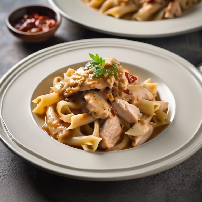 Delicioso plato de pollo y pasta en una salsa cremosa con un toque de chile morita para un sabor picante y ahumado.