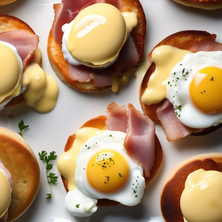 A classic and delicious breakfast dish featuring perfectly poached eggs, savory ham, and rich Hollandaise sauce atop English muffins.