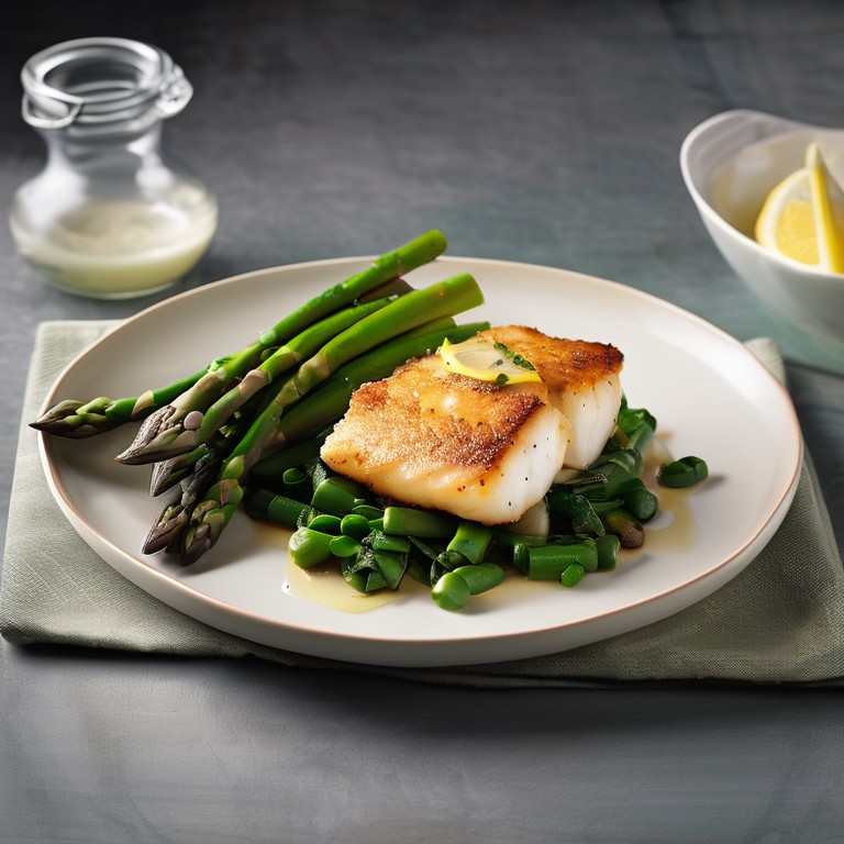 Ein leckeres und gesundes Gericht mit gebratenem Kabeljau, frischem Spargel, Spinat und Kartoffeln. Perfekt für ein ausgewogenes Abendessen.