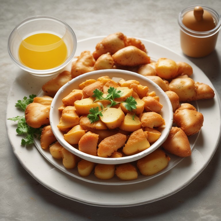 Um prato delicioso de frango crocante acompanhado de batatas inglesas fritas, perfeito para uma refeição reconfortante e saborosa.