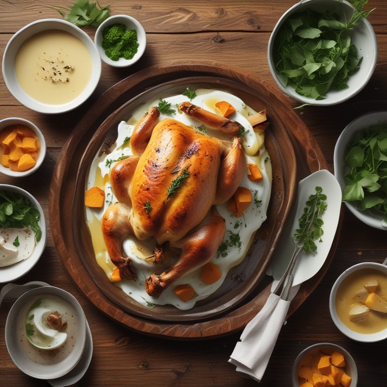 Um prato delicioso de frango assado com abóbora cabotiá, temperado com cebola, alho e um molho de iogurte refrescante.