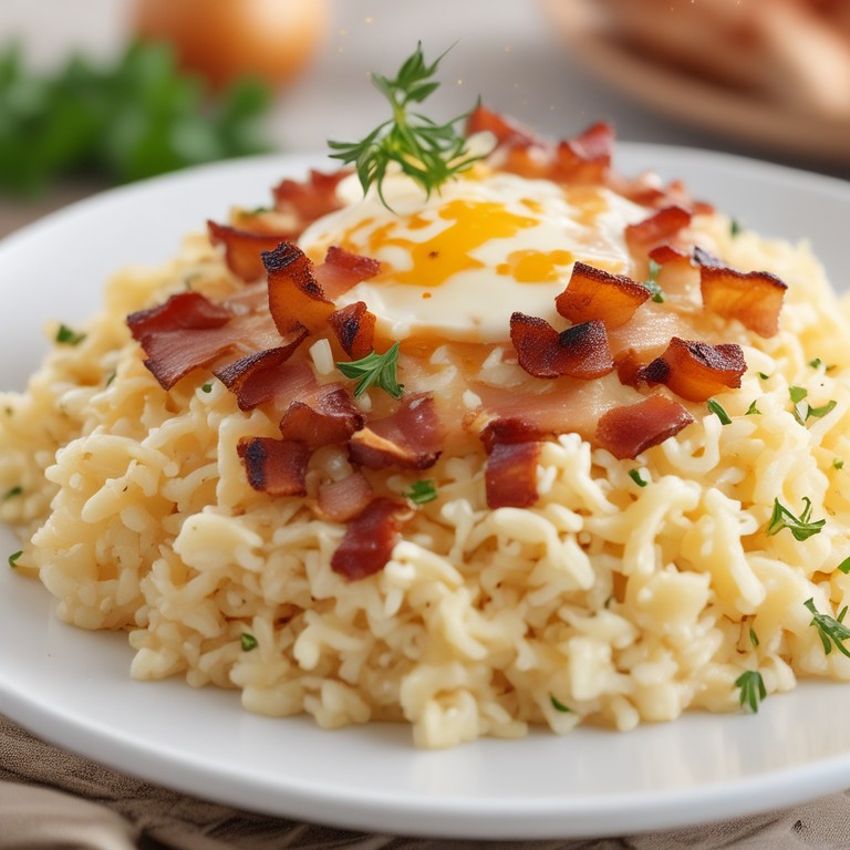 A delicious and savory rice dish with crispy bacon, caramelized onions, creamy cheese, and a hint of richness from the cream. It's a comforting and flavorful meal that is easy to prepare.