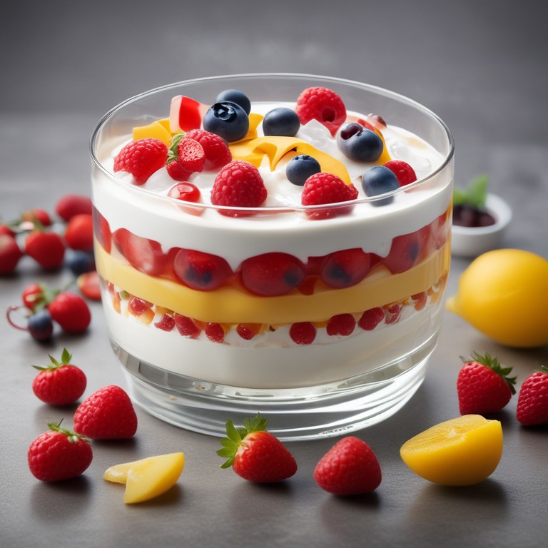 A refreshing and fruity dessert combining the goodness of gelatin, yogurt, and fresh fruits like strawberry, grapes, and mango. Perfect for a light and flavorful treat!