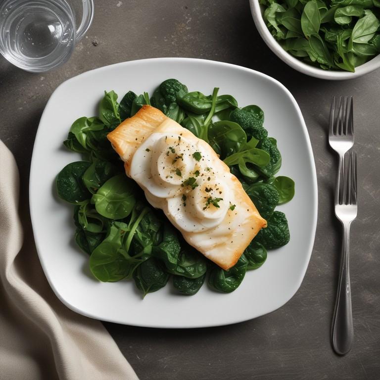 Un délicieux plat français de colin d'Alaska servi sur un lit d'épinards frais, assaisonné à la perfection.