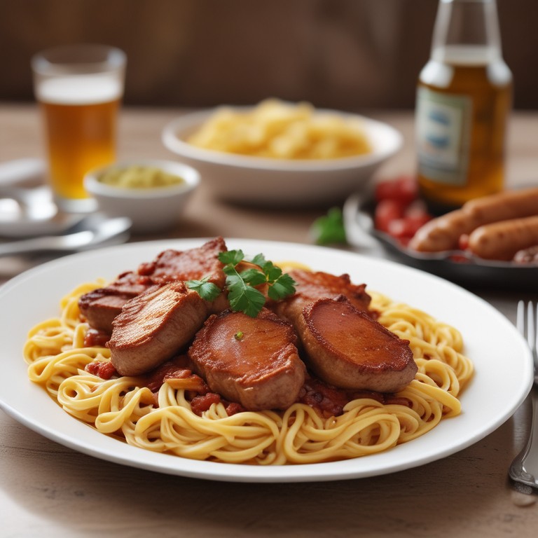 Uma deliciosa receita de bifanas de porco em um molho saboroso de cerveja, acompanhada de chouriço e massa. Perfeito para uma refeição especial!