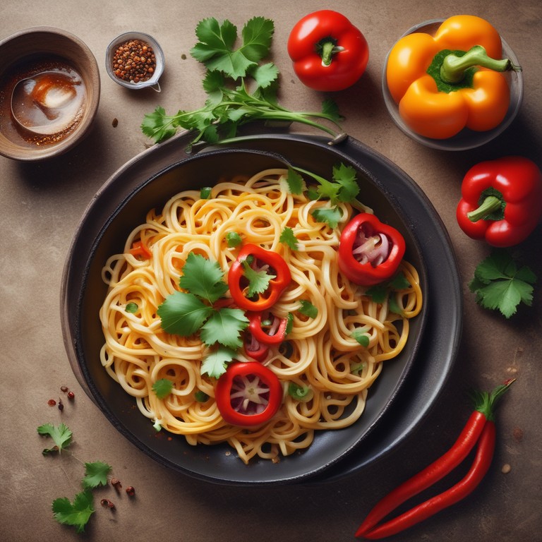 A flavorful and spicy Indian-inspired noodle dish with a blend of aromatic spices and vegetables.