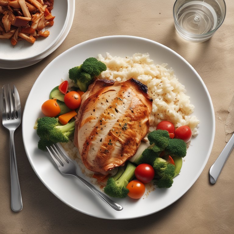 Ein köstliches und gesundes Gericht mit gebratener Putenbrust, knackigem Gemüse und würzigem Reis.